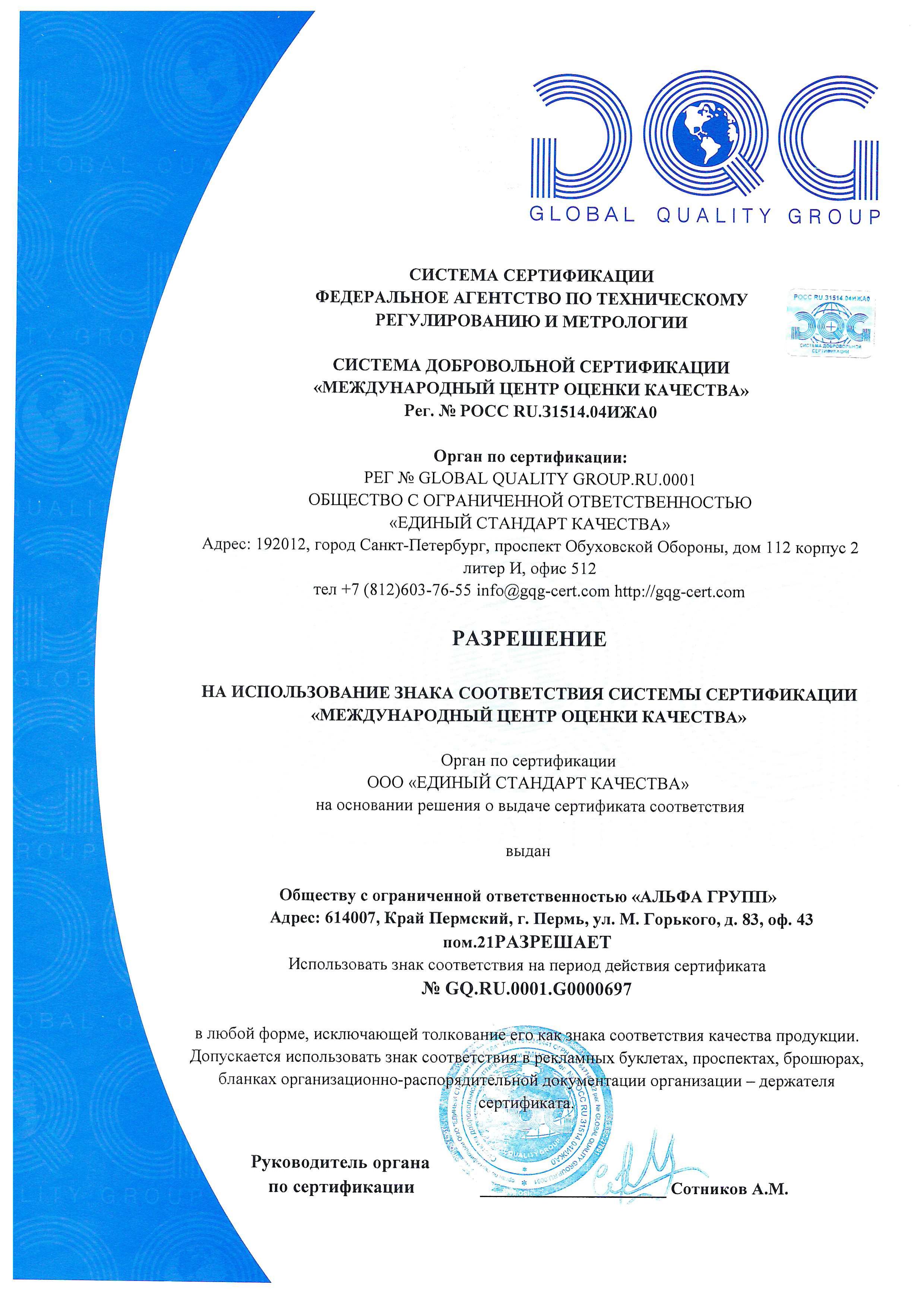 Разрешение на использование знака соответствия ISO 9001 - 2015